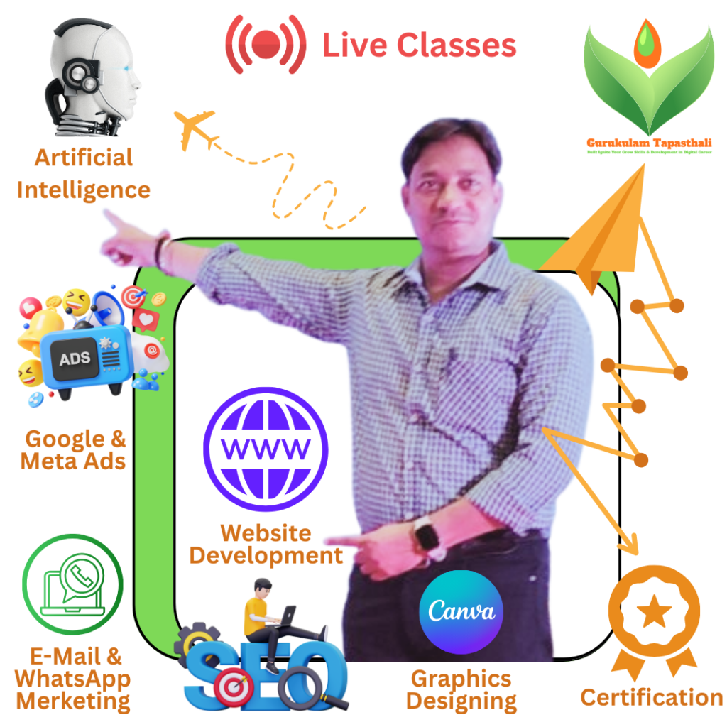 Gurukulam Delhi is an autonomous Institute which functions under the aegis of Ministry of Education, Government of India. It aims to provide instructions and research facilities in various disciplines of Digital Marketing, AI-Artificial Intelligence, Website Designing, Graphics Designing, Google & Meta Ads, Email & WhatsApp Marketing, SEO and Many More Programs in Live Classes for advance learning and dissemination of knowledge.